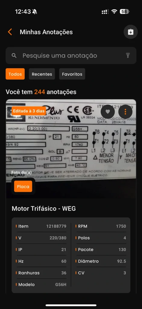 Registre todos os dados dos motores – Dados de bobinamento, informações mecânica – Fotos de Placa, Foto do motor completo, fichas originais e diagrama de ligação.